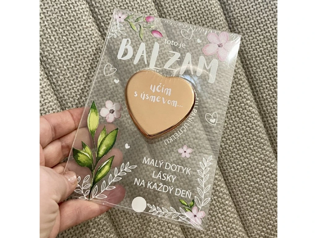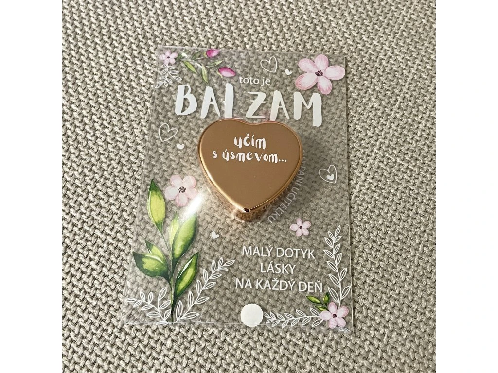 Darček, ktorý zahreje pri srdci a zároveň zjemní pery. Balzam je pripevnený na transparentnej darčekovej kartičke. Perfektný darček pre pani učiteľky, asistentky či vychovávateľky. Malé ďakujem s veľkým úsmevom.