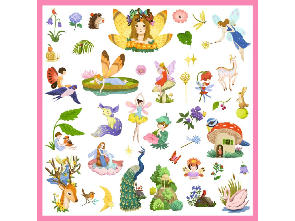 Samolepky s motívom fantazijných lesných bytostí. Farebné ilustrácie víl, elfiek, jednorožcov, zvieratiek a dobrých duchov sú ozvláštnené zlatým metalickým leskom s dúhovým efektom