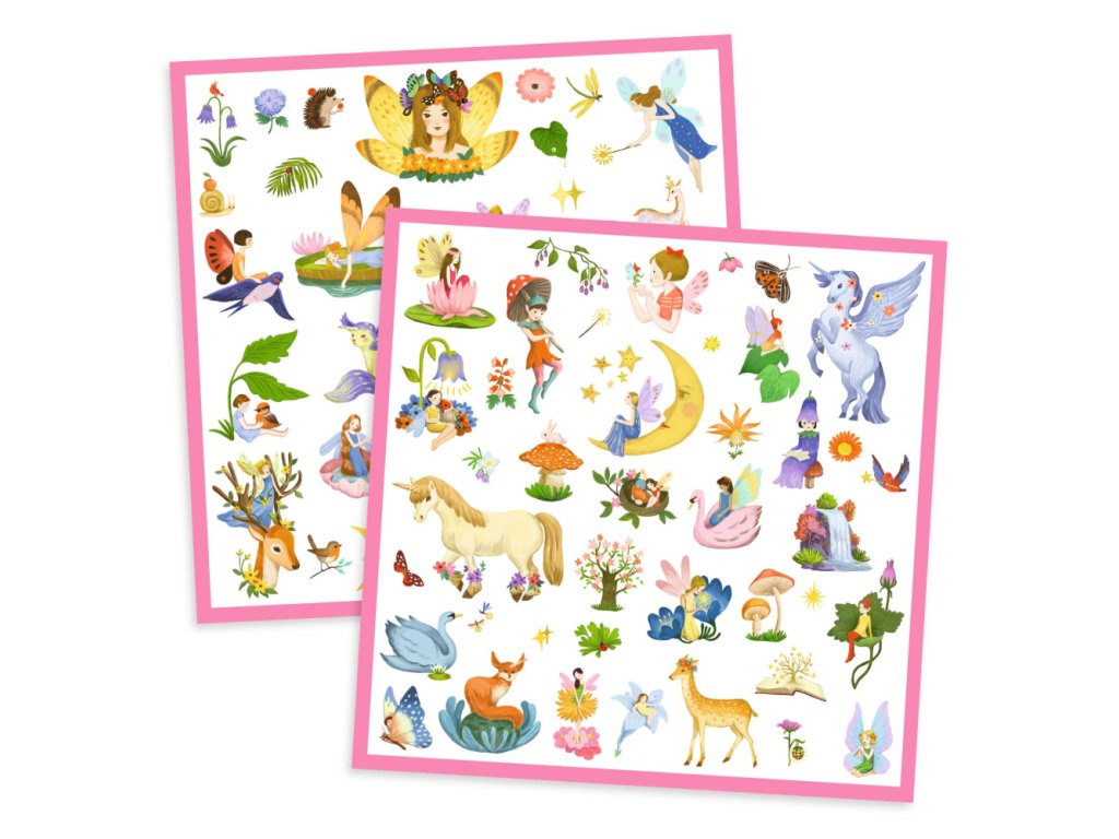 Samolepky s motívom fantazijných lesných bytostí. Farebné ilustrácie víl, elfiek, jednorožcov, zvieratiek a dobrých duchov sú ozvláštnené zlatým metalickým leskom s dúhovým efektom.