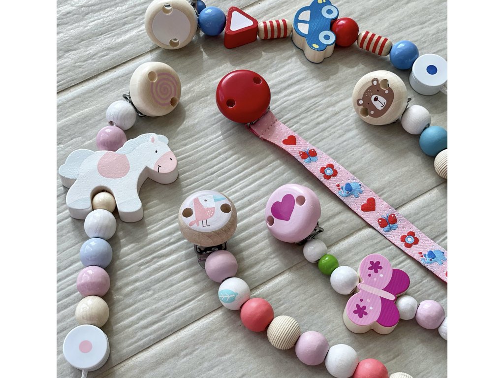Nádherná šnúrka na cumlík s praktickým dreveným klipom pre bezpečné upevnenie.