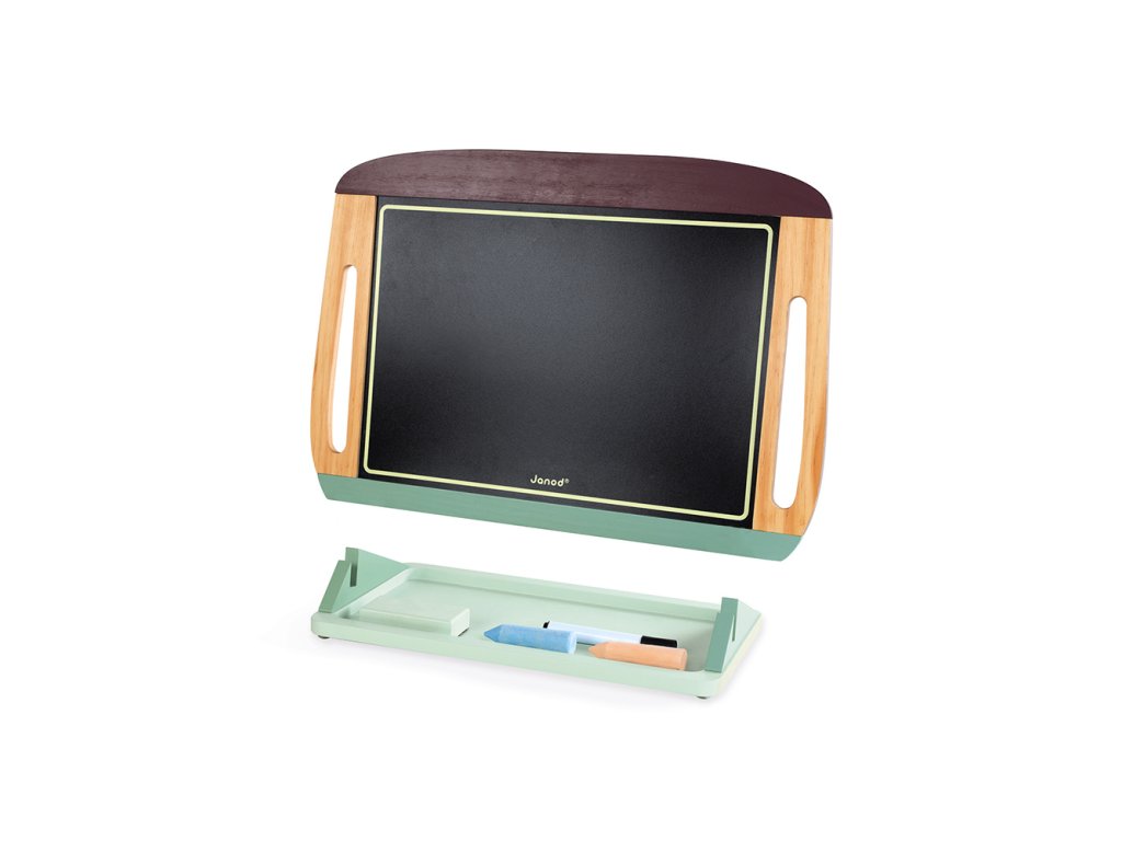 Obojstranná magnetická tabuľa z dielne obľúbenej francúzskej značky Janod - čierna strana je na písanie a kreslenie kriedou a biela strana tabule je magnetická a vhodná na ukladanie magnetiek, či písanie a kreslenie fixkou.