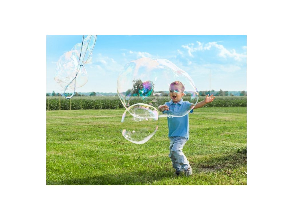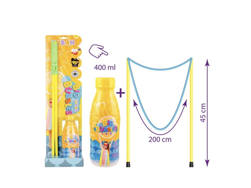 Sada mydlových bublín obsahuje paličky so šnúrkou dlhou približne 200 cm a 400 ml fľašu s tekutinou, ktorá je perfektná na vytváranie krásnych, veľkých a dlhotrvajúcich bublín. Stačí naliať trochu tekutiny, ponoriť obruč a krásne bubliny sú na svete.