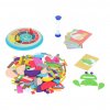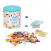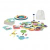 Obsahuje: základovú dosku pre posúvanie bodov, presýpacie hodiny (1 minúta), 250 drevených geometrických tvarov, 100 kartičiek sa zadaním