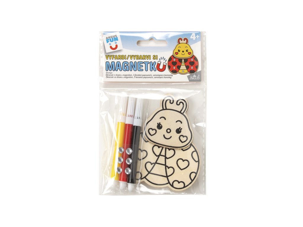 Drevenú magnetku si dieťatko vyfarbí podľa svojej fantázie, dolepí samolepiace kamienky a môže pripevniť na kovový povrch.